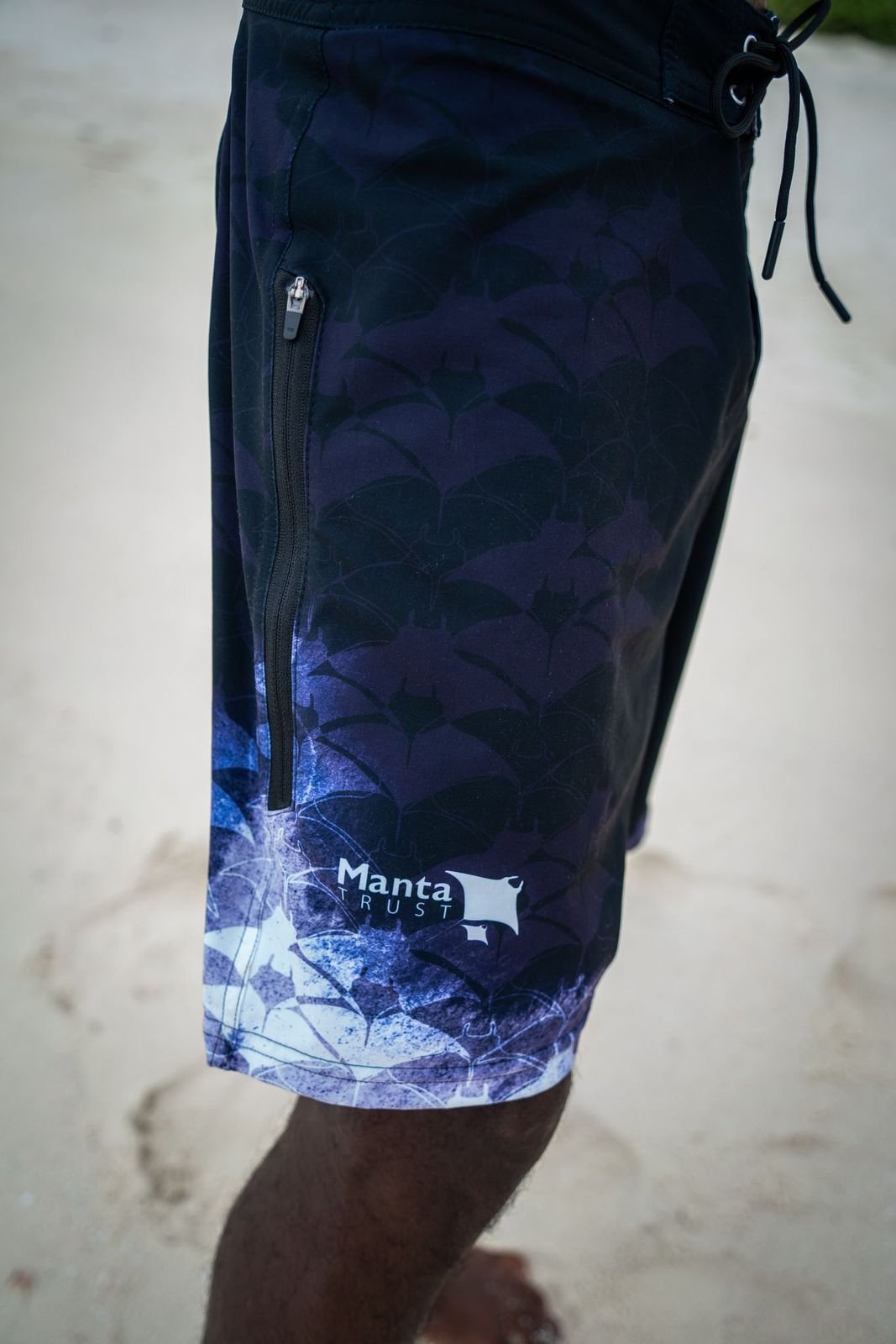 The Black Manta design draws inspiration from the striking chevron markings found on reef and oceanic manta rays. Paired with subtle, hand-drawn manta silhouettes, these shorts combine elegance with a bold, ocean-inspired edge - sleek for the water, sharp on land.