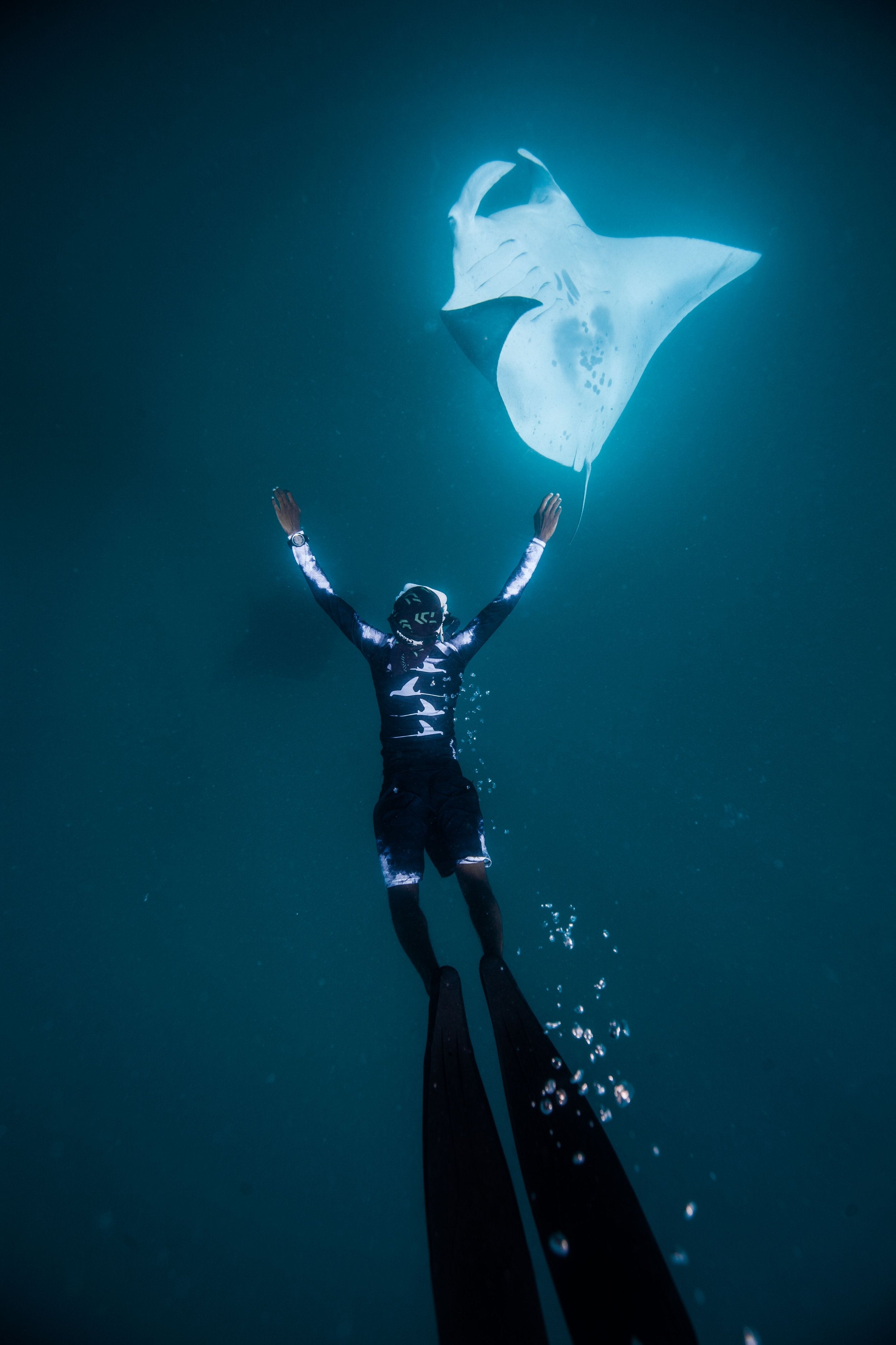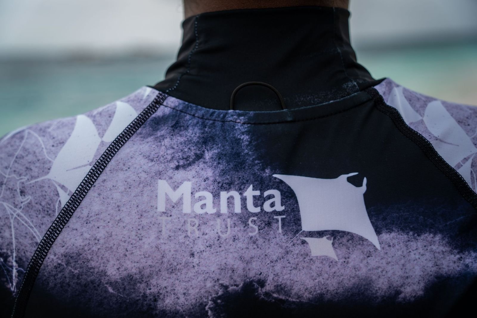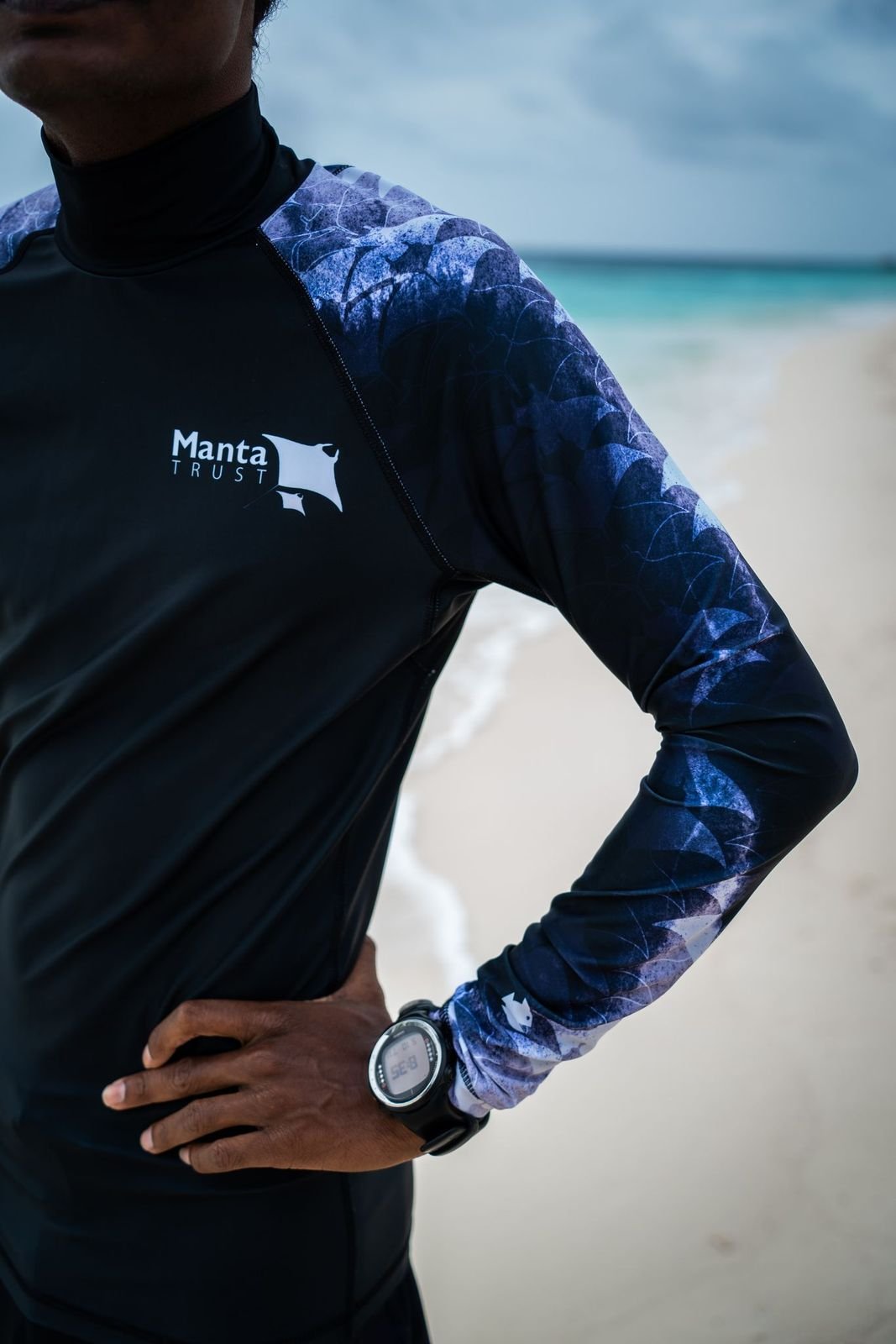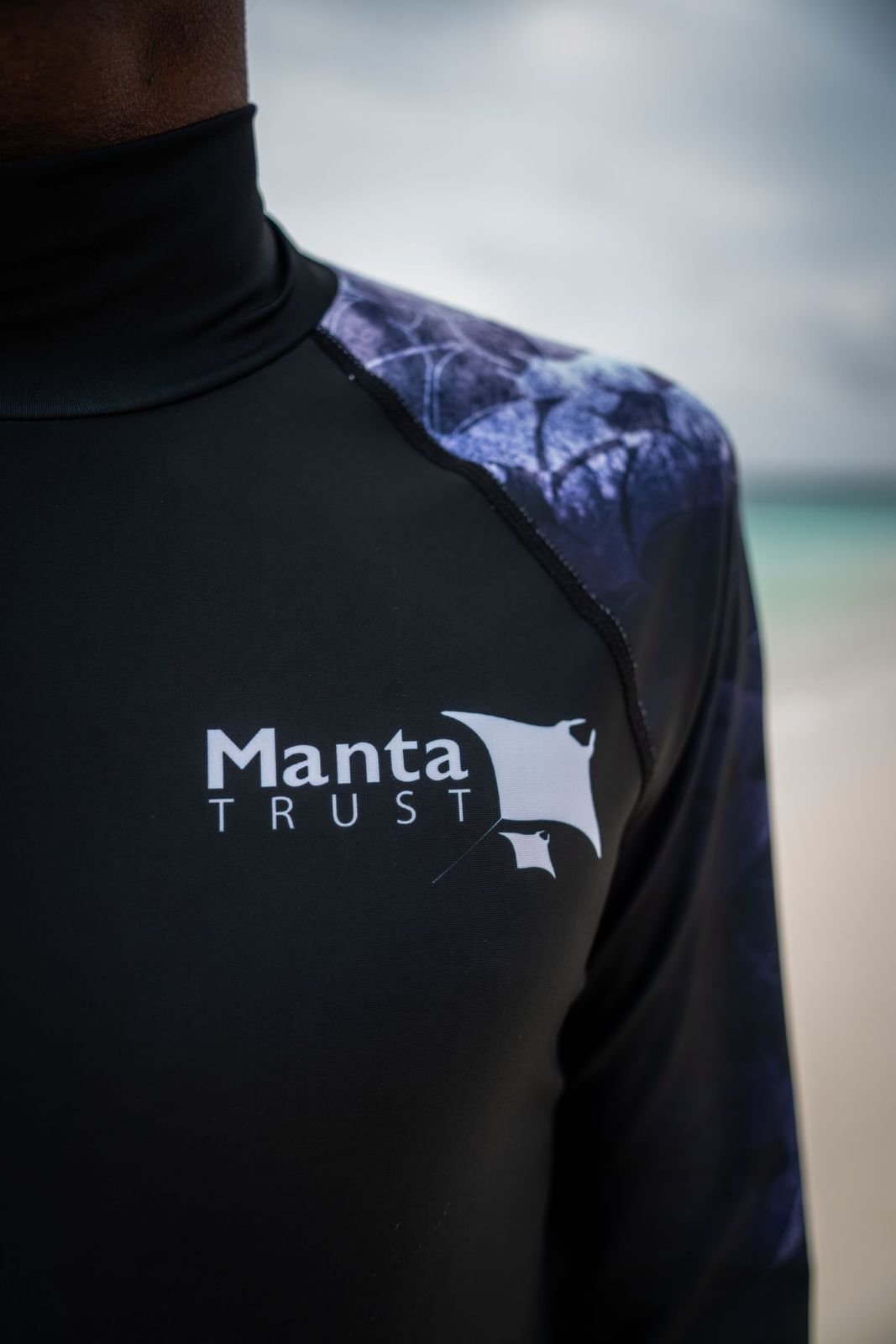The Black Manta design takes inspiration from the striking chevron markings found on the dorsal side of oceanic and reef mantas - combined with a hand-drawn manta silhouette pattern woven seamlessly into the sleeves. Bold, elegant, and unmistakably ocean-inspired.