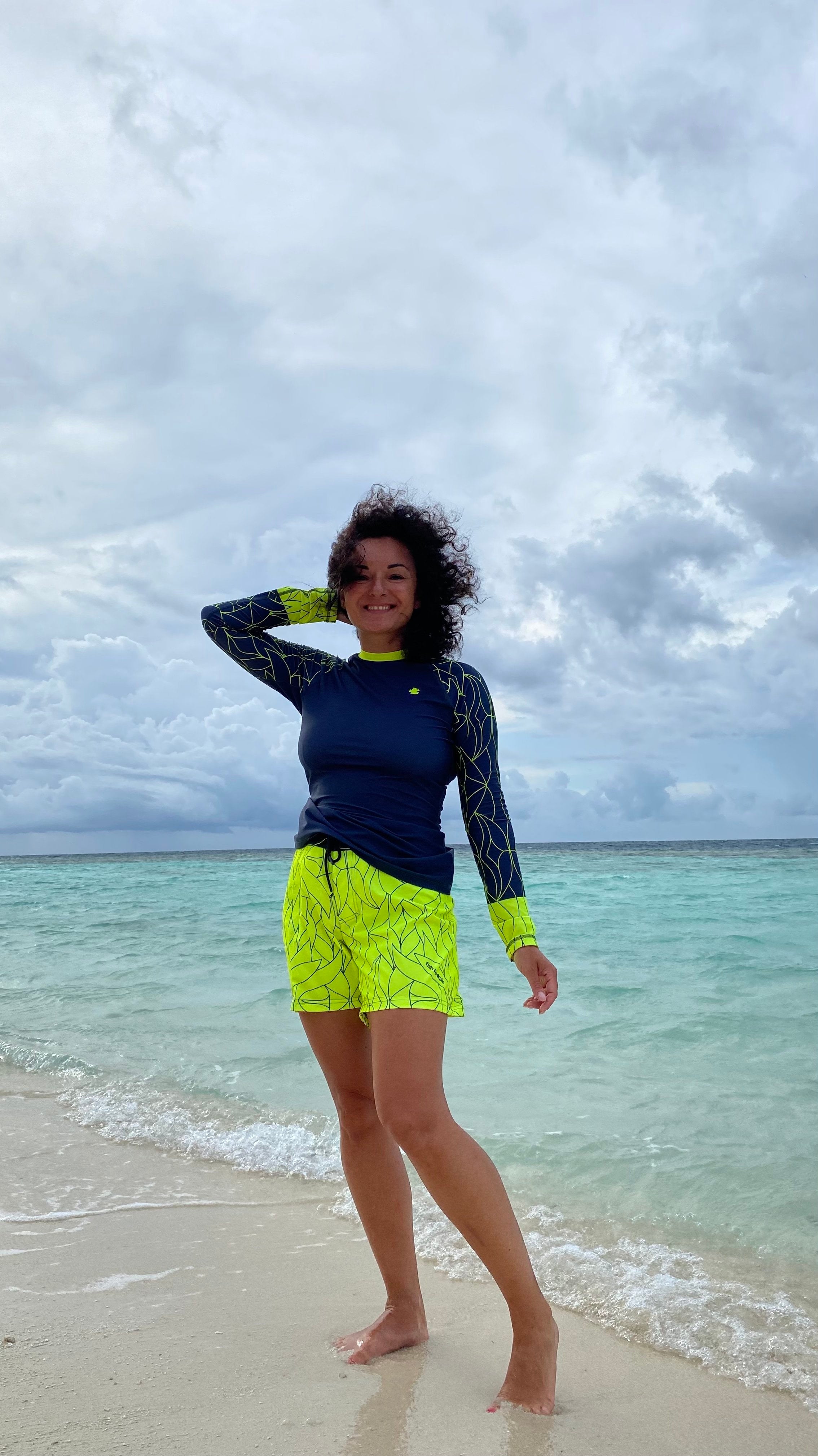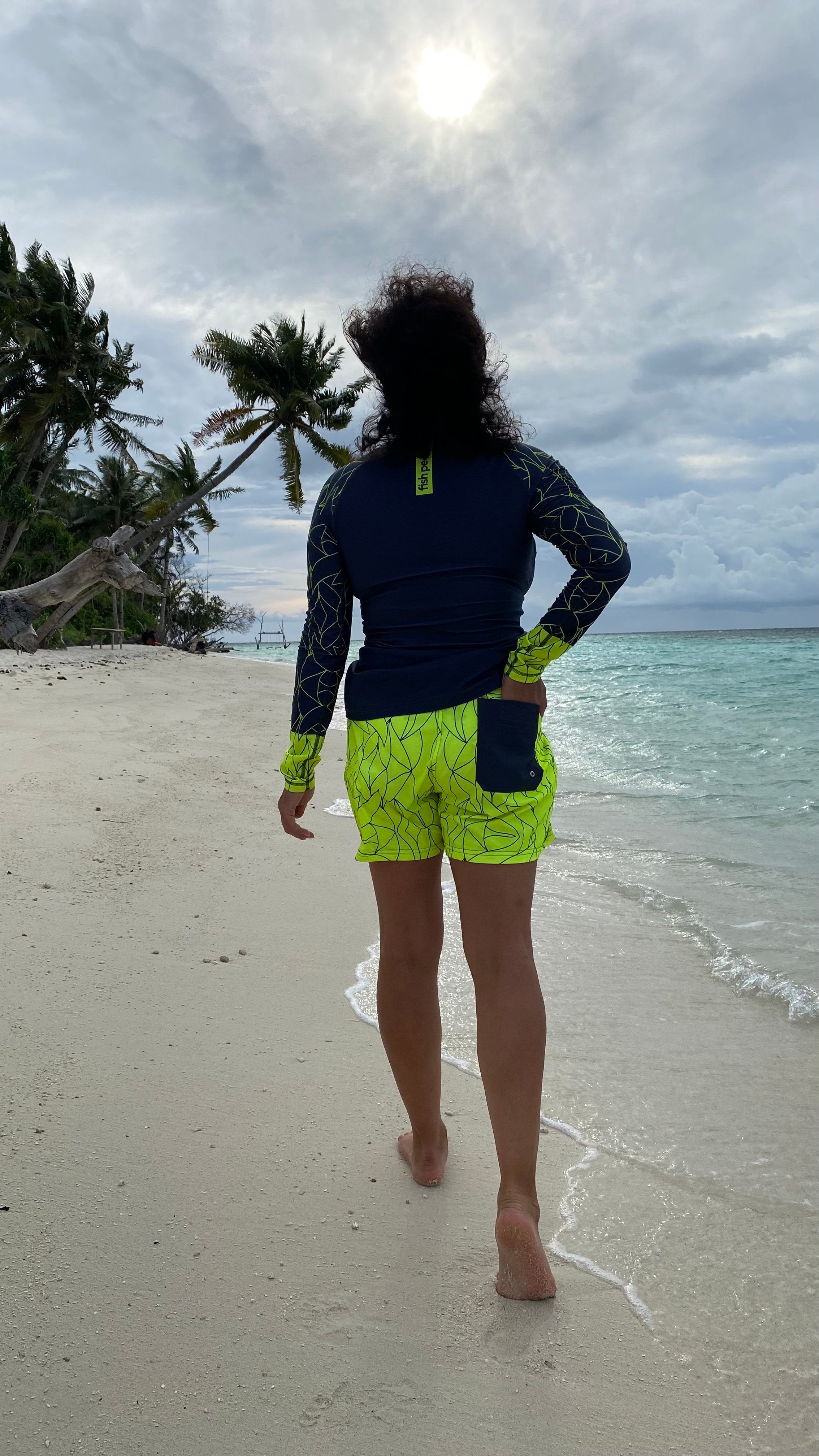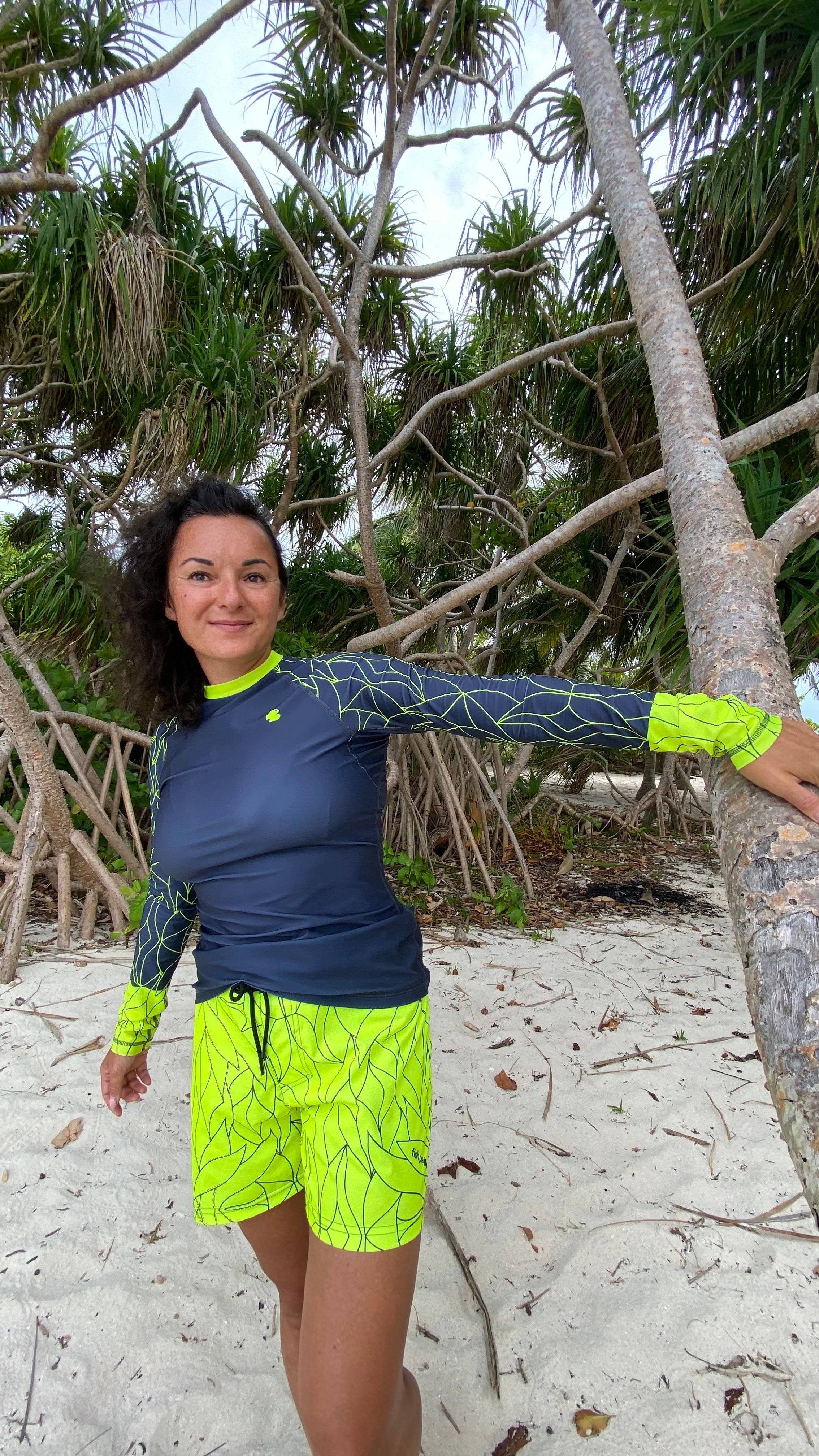 xNeon is the last colour to disappear underwater, BE VISIBLE! Funky banana - neon print, signature neon Fishpeople favourite colour, relevant as for the dive guides and instructors - to be seen during the dive, and super visible while snorkeling with manta rays or whale sharks.