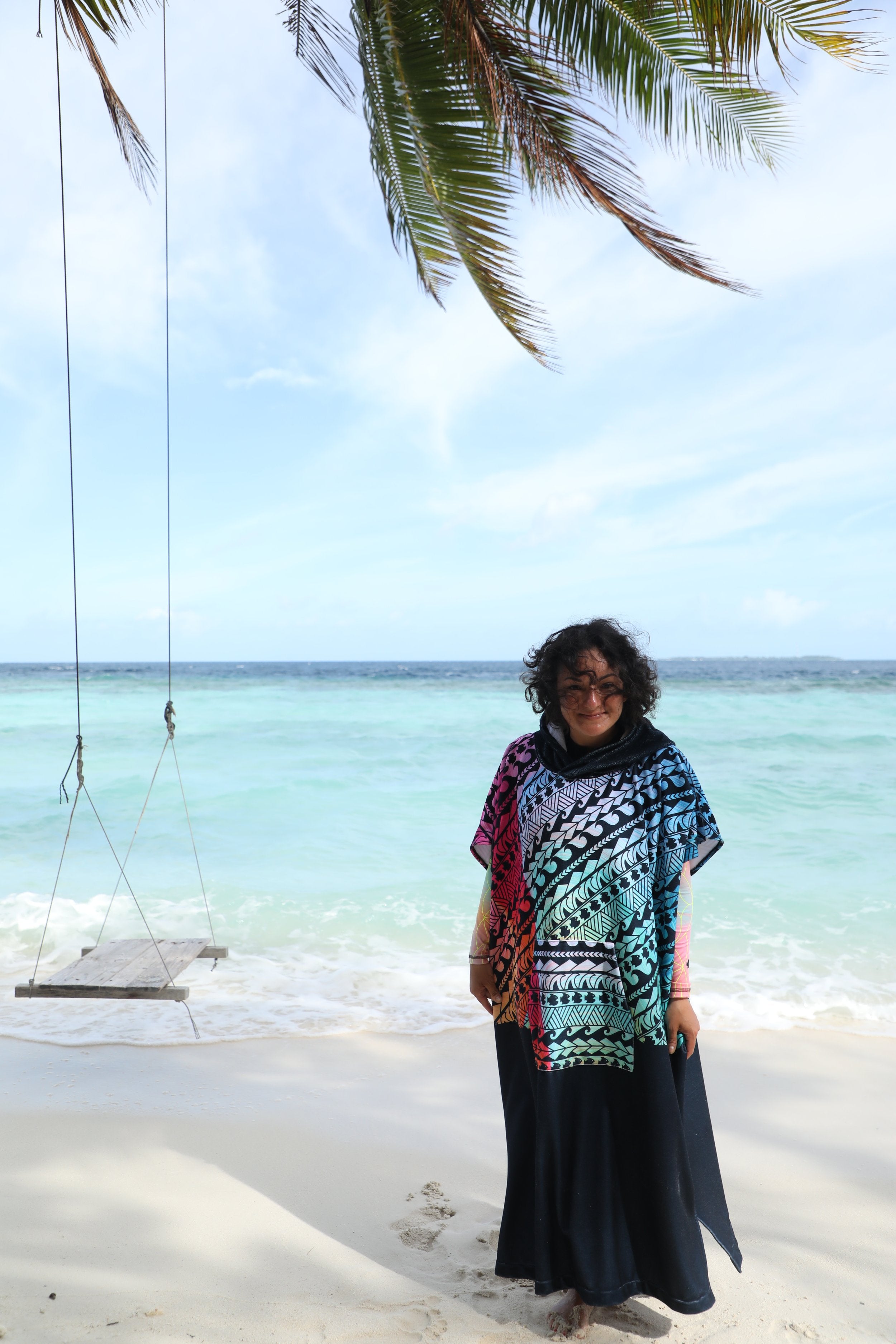 Travel-friendly – oversized when worn (110 × 90 cm for max comfort), yet folds down surprisingly compact for luggage
