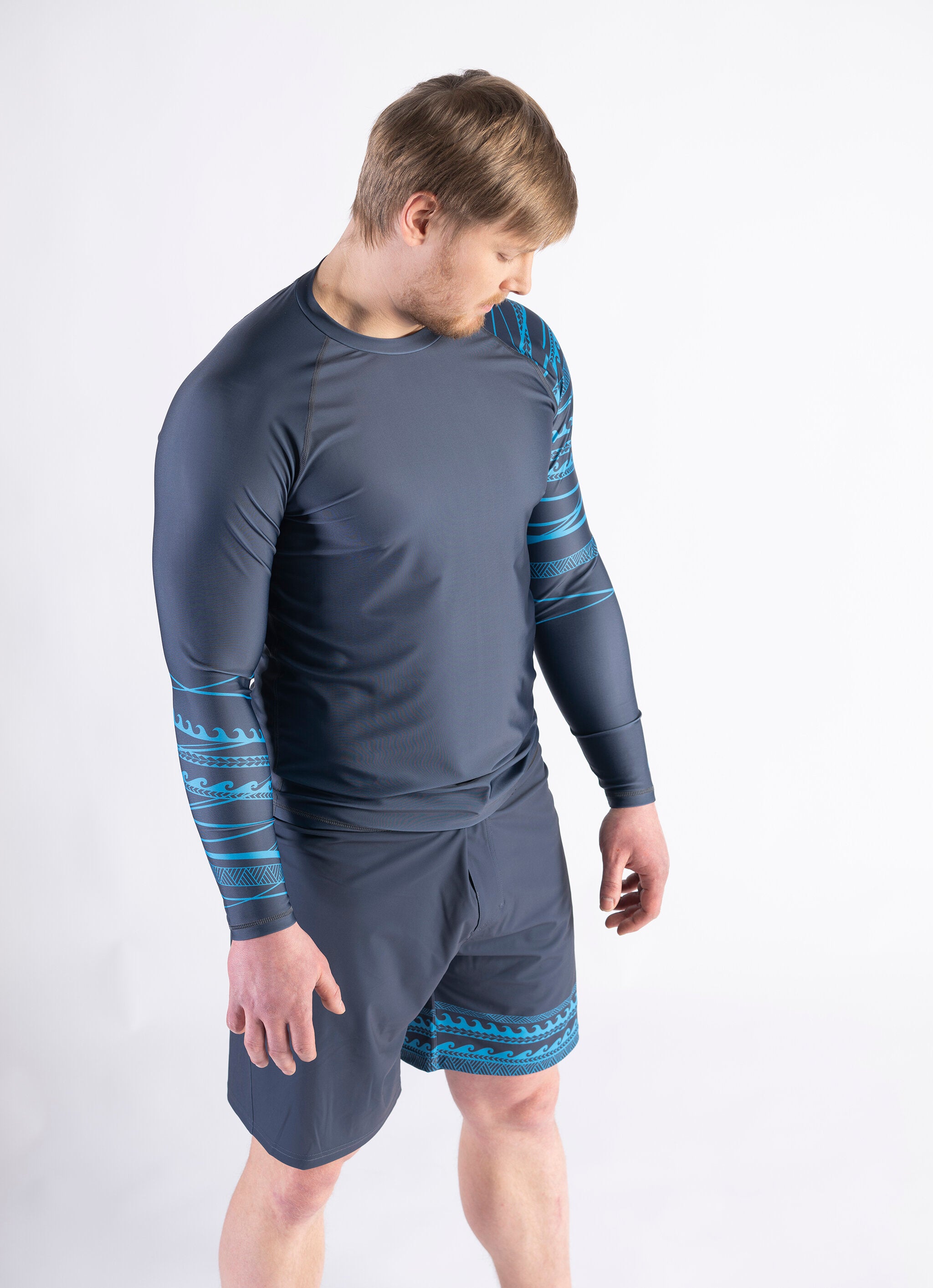 Made from recycled ocean waste. Emils is wearing 2XL size Rashguard in Grey/ Pacific Blue; he is 195 cm tall and 115 kg awesome.