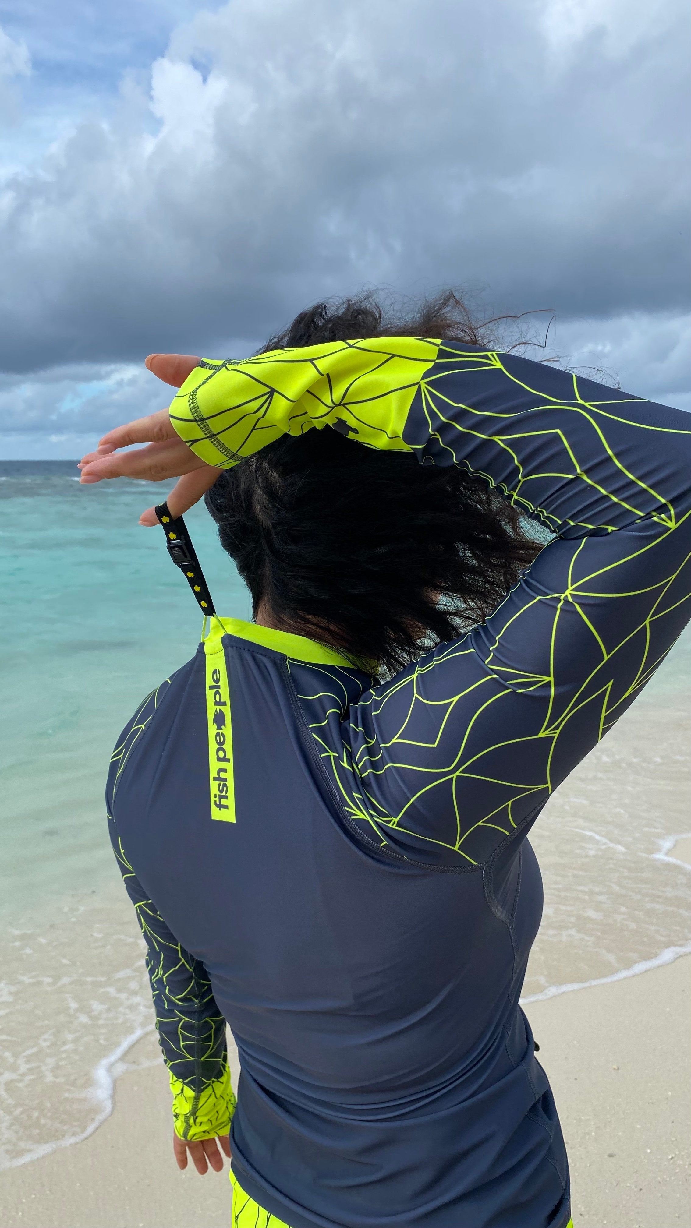 xElegant and classy pacific grey with daring neon to shine bright underwater or while catching the waves! YES, extremely visible - neon yellow is the last to disappear underwater!