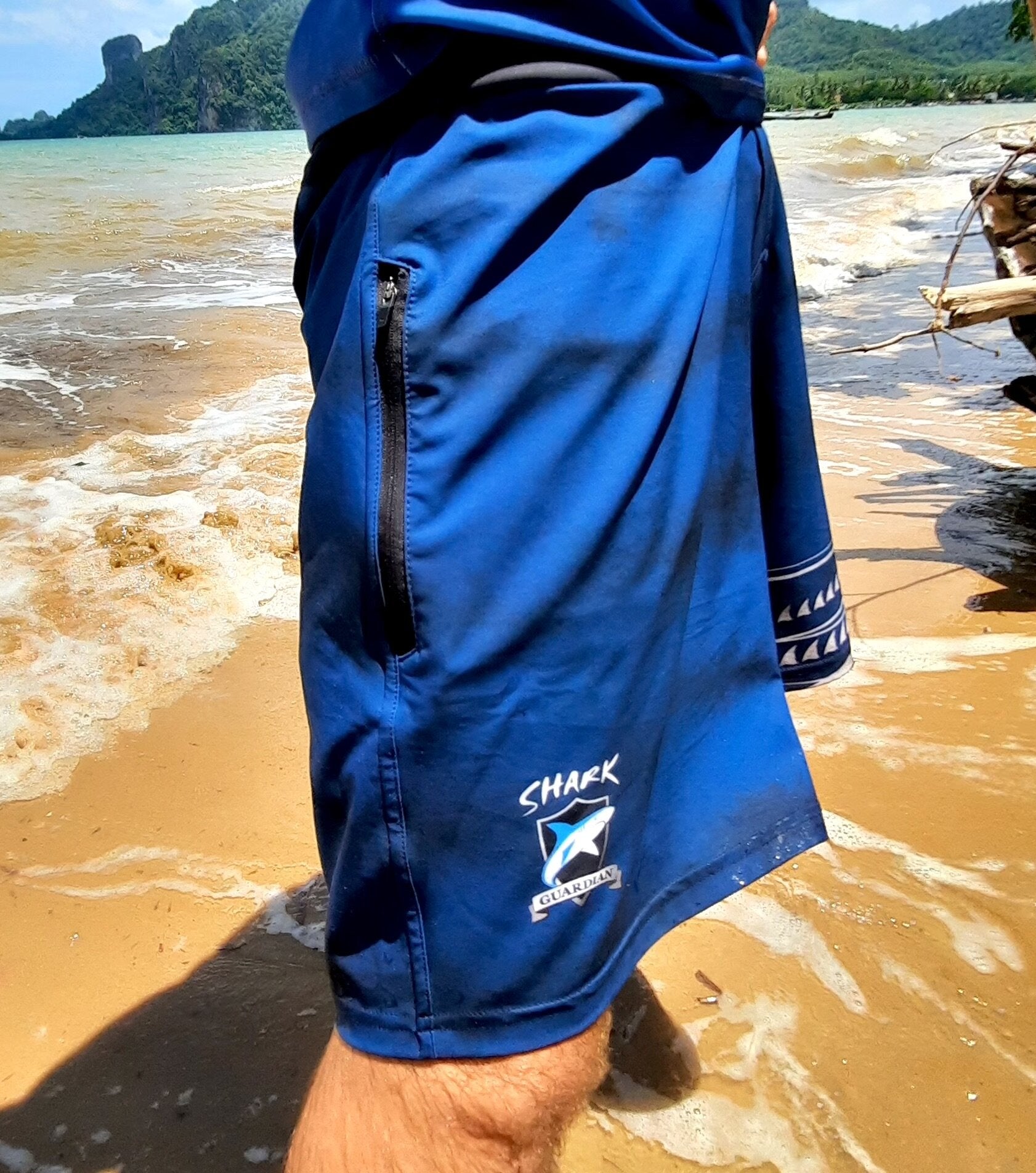 Board shorts featuring the Shark Guardian logo, Tiger Shark shading Shark Guardian board shorts featuring the Shark Guardian logo, Tiger Shark shading and shark fin design at the end of the shorts.