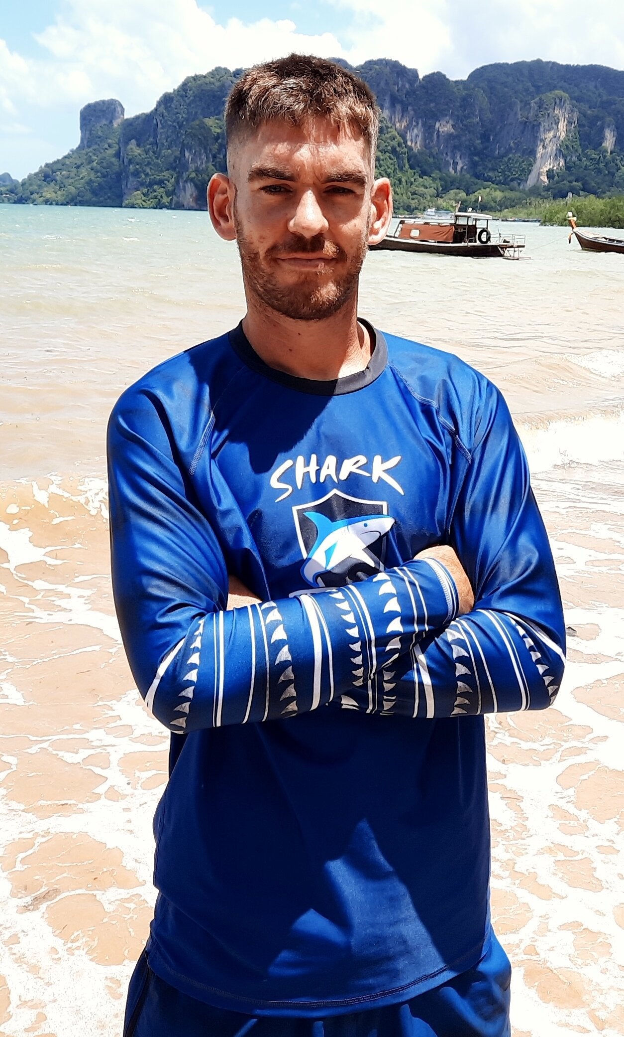 Shark Guardian mens rashguard featuring the Shark Guardian logo, Tiger Shark shading and shark fin design on the sleeves.