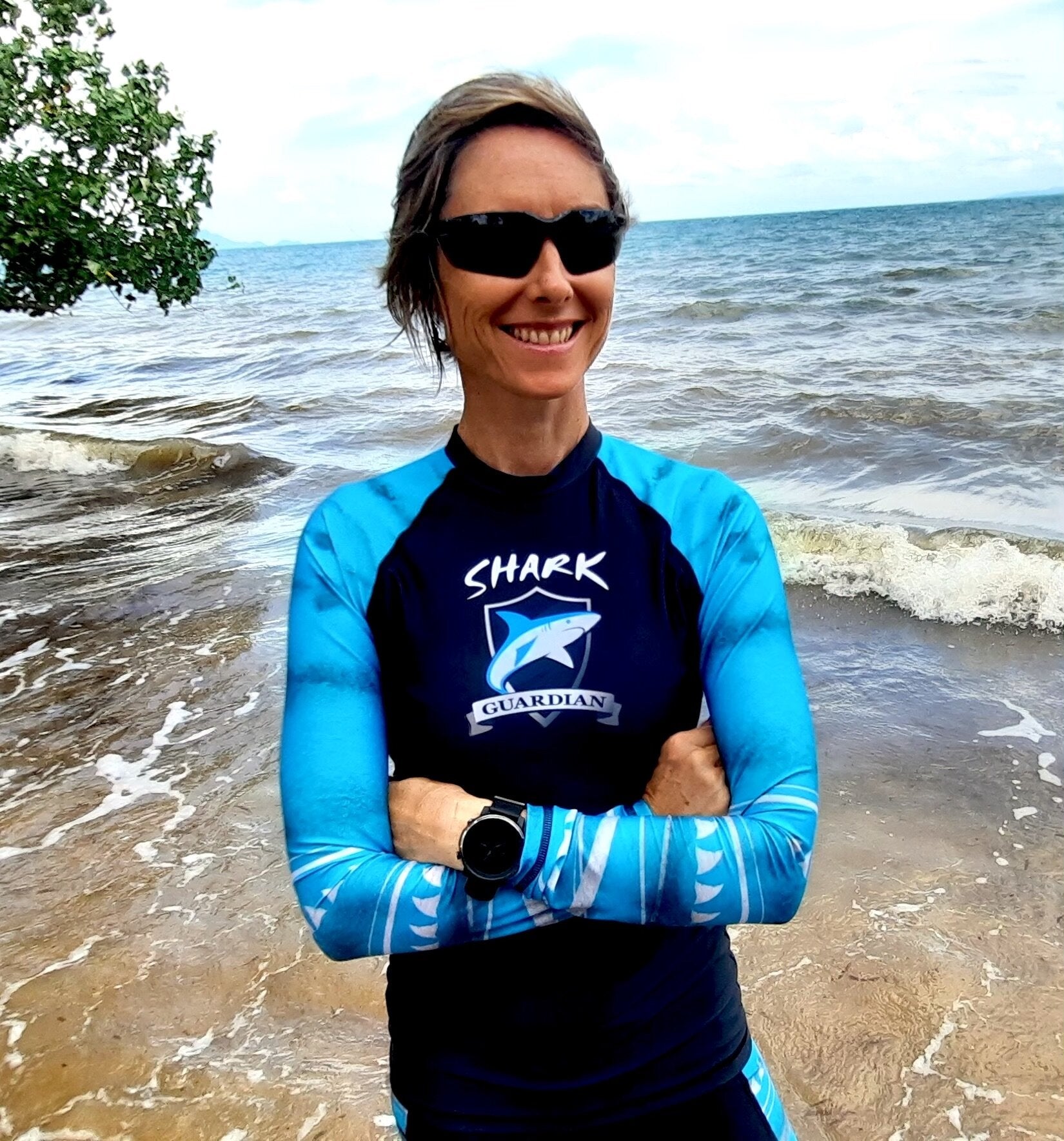 Shark Guardian rashguard featuring the Shark Guardian logo, Tiger Shark shading and shark fin design on the sleeves in elegand light turqoise ocean colour.
