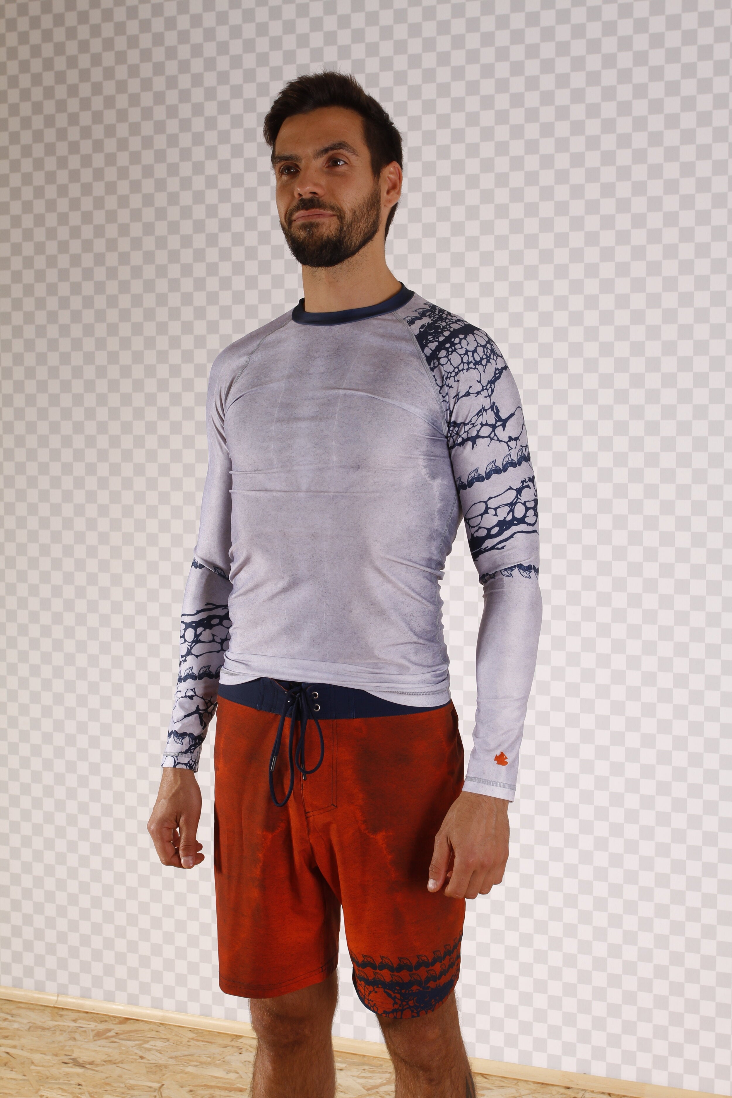 Board shorts in rusty orange with the darken grey blurry stain structure to showcase the unique skin pattern of the tiger shark, highlighting the spots that with the shark aging transform into stripes.