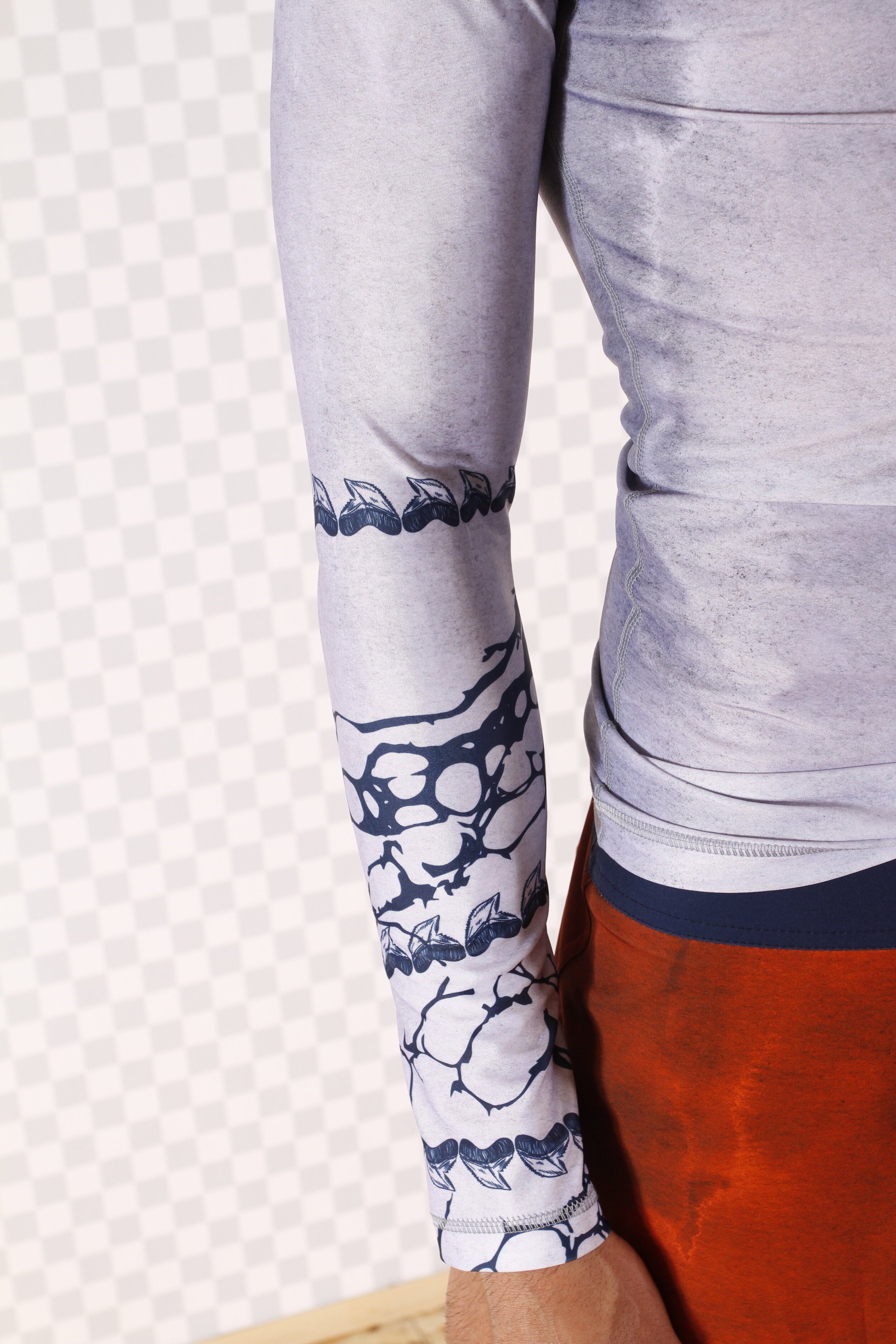 The tooth pattern was hand-drawn and translated into graphics and later incorporated into our Maori pattern on the sleeve.